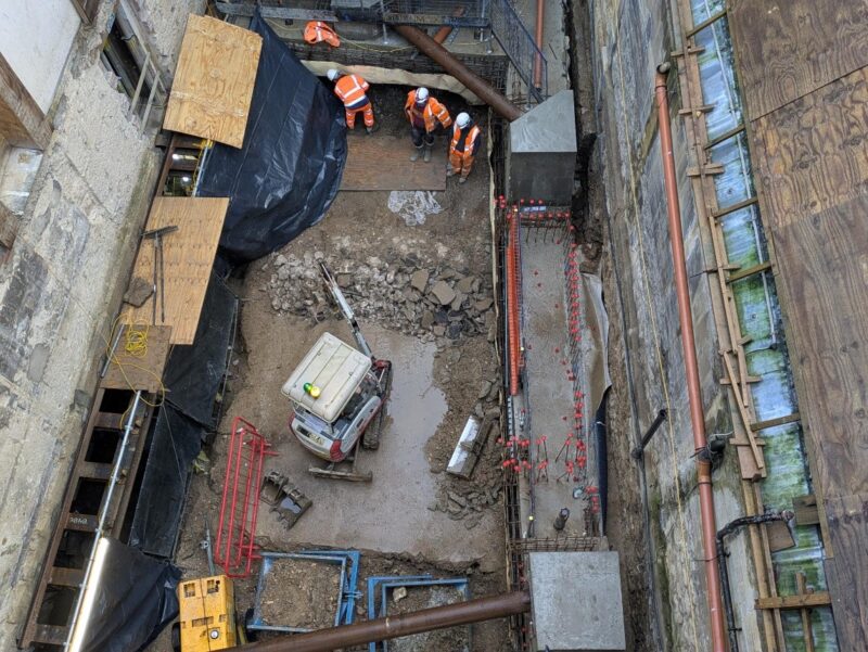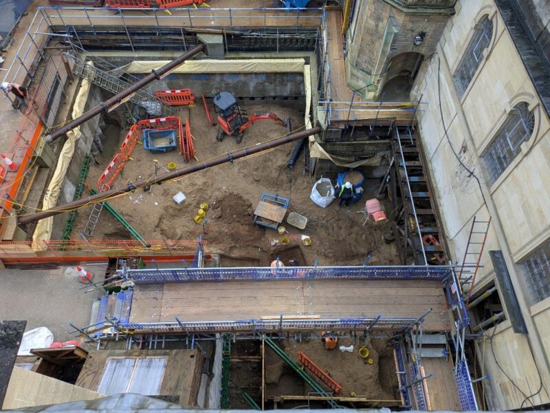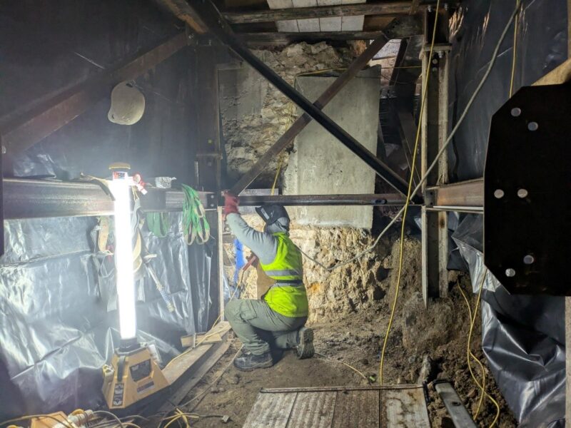 Bracing is being installed to the southern arrangement of bearing piles in the former chapel. This has allowed Oxford Archaeology, in conjunction with Goldmax, to commence the underpinning excavations to the eastern wall. Two pins have been poured, and these will be dry packed shortly before further pins are excavated and cast next week.