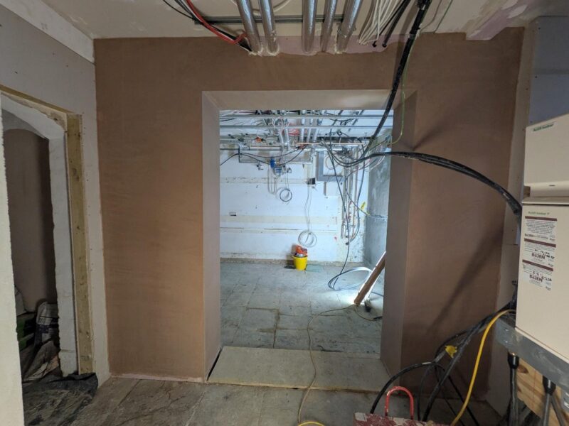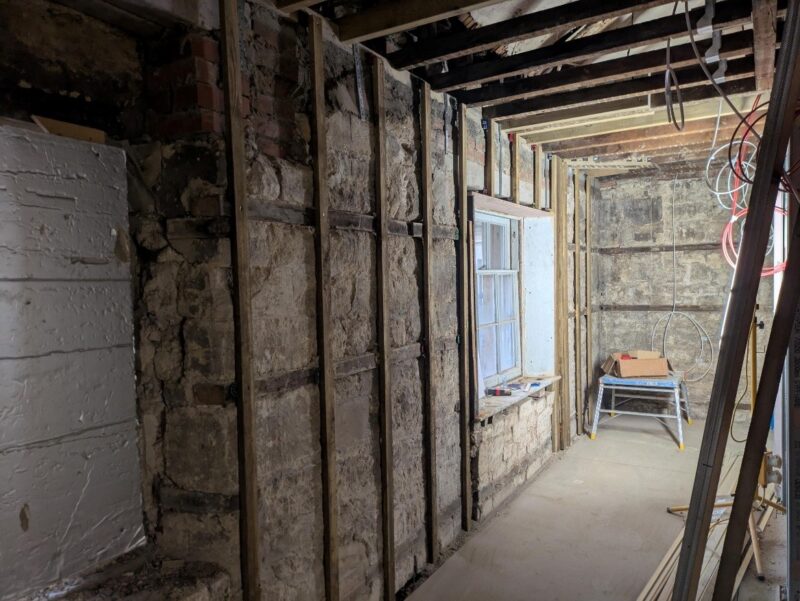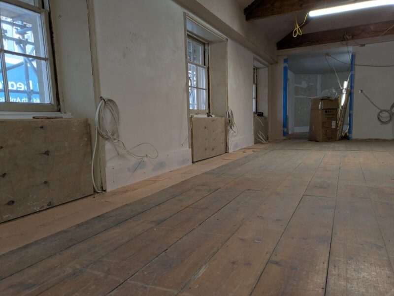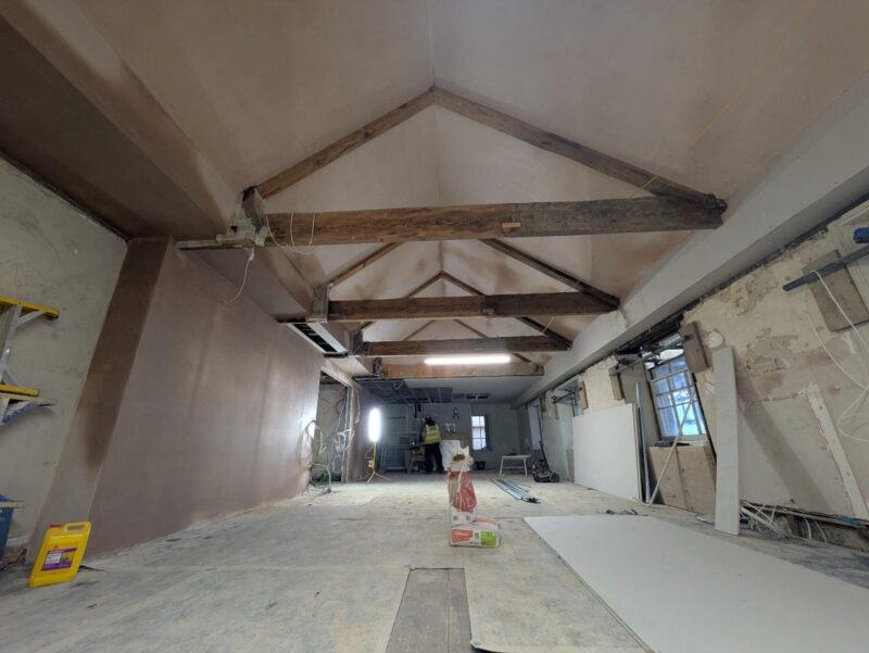 Following the replacement of the lintels, the carpenters have repaired the additional rotten timbers and are now re-instating the laths on the external walls in advance of the lime plaster works. This plastering is continuing in other areas as well. Berkeley Interiors are continuing to board up the walls and install new ceilings with the gypsum plasterers skimming these areas as they become available.