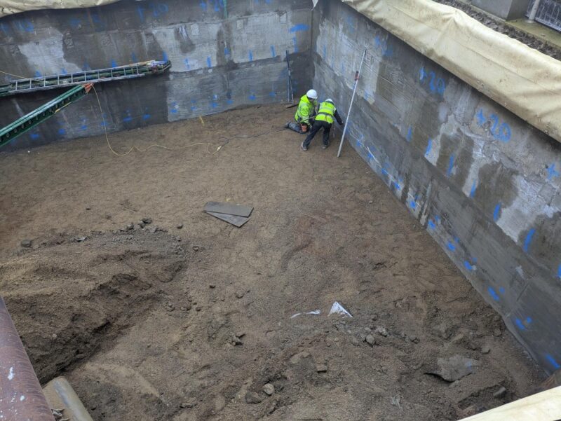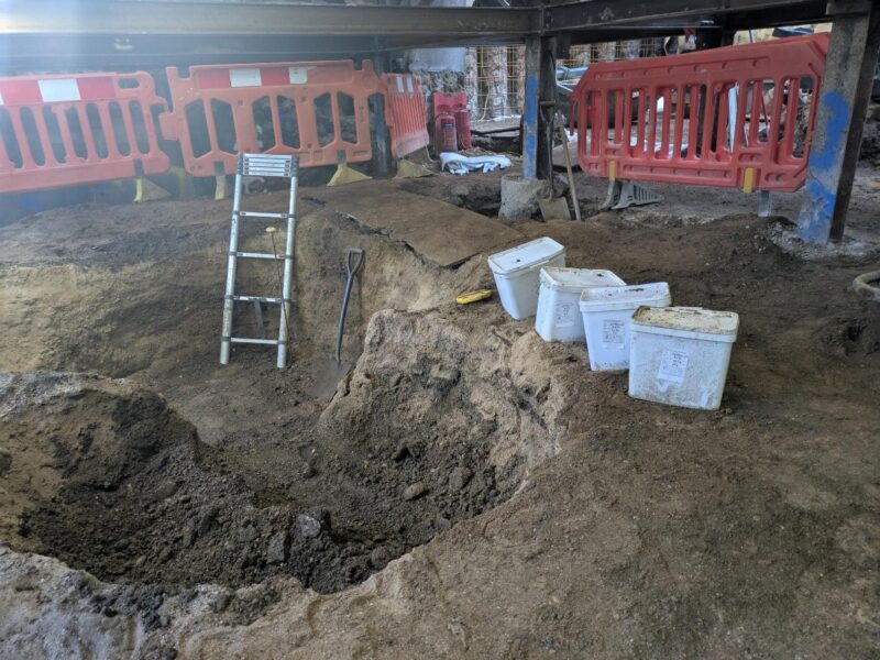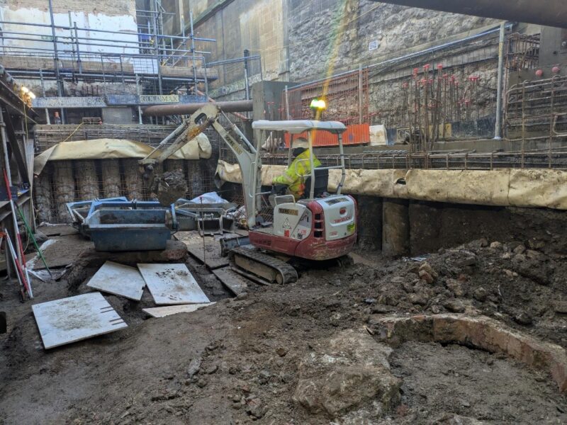 In the ‘extension’ area, Oxford Archaeology continue to excavate the remaining area with the old drainage chambers and masonry structures uncovered, recorded and then removed. The ground works contractors are doing facing wall works to the new piles around the archaeological excavation.