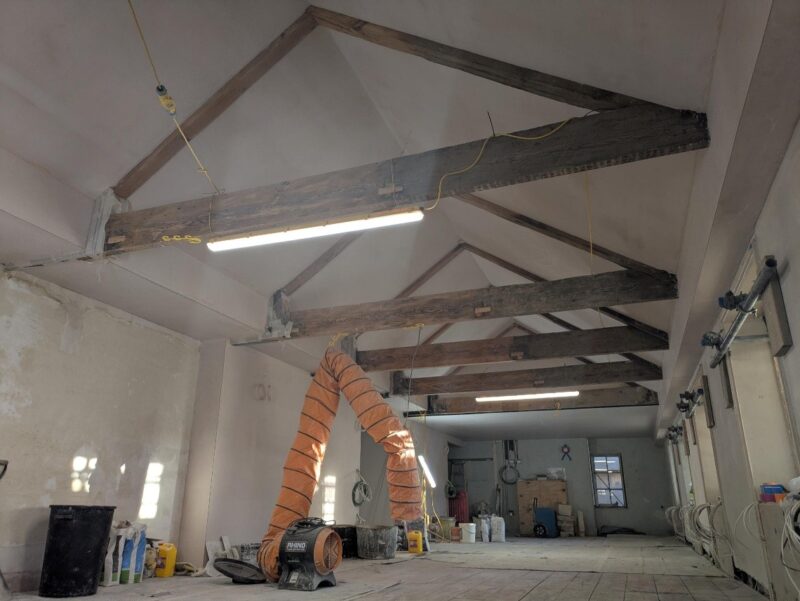 The lime plastering is progressed well, especially around the windows and the chimney breast. Berkeley Interiors continue to board up walls and install new ceilings. The new second floor reading room is taking shape.