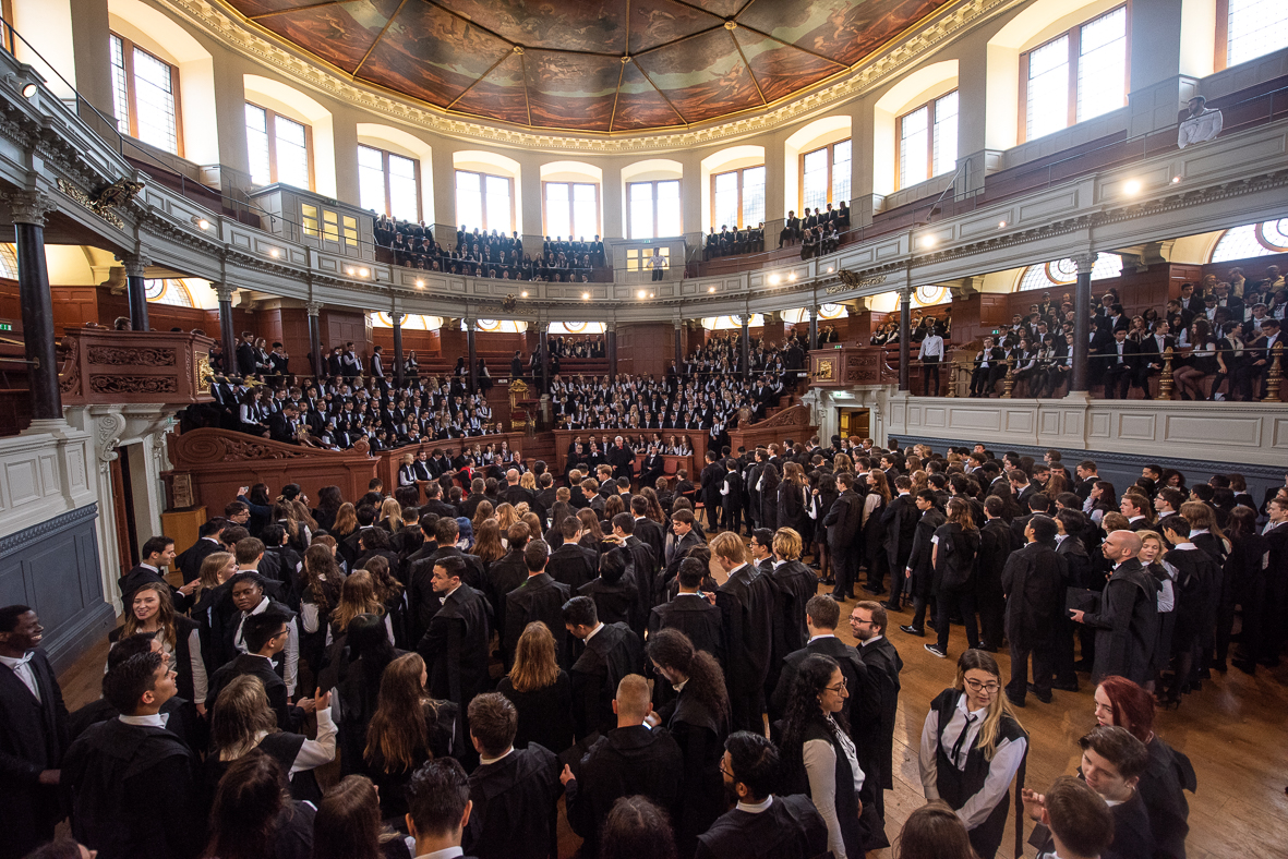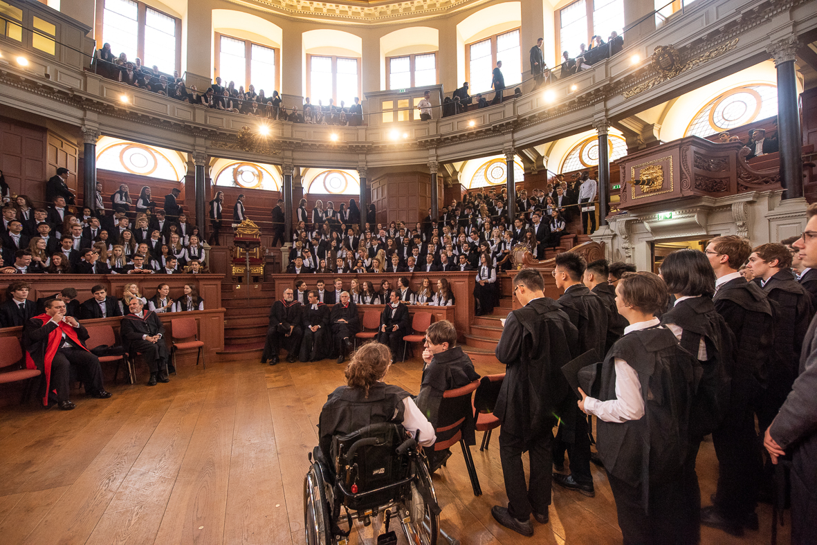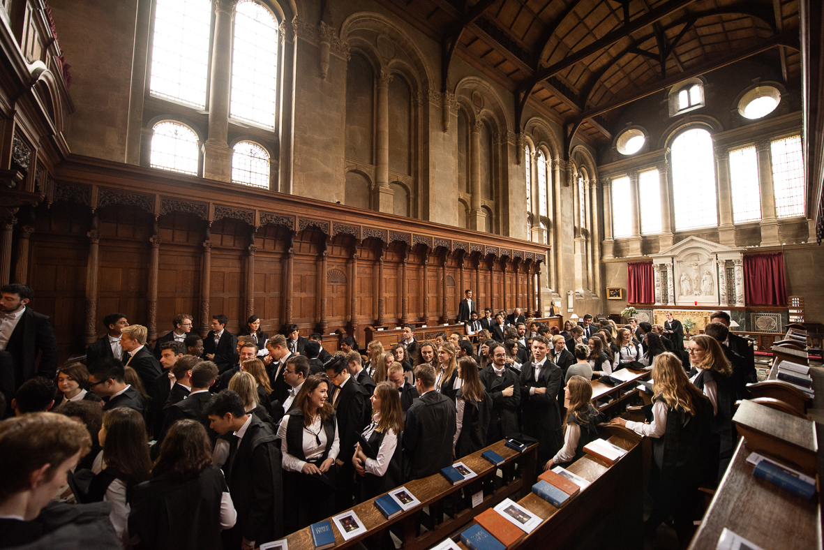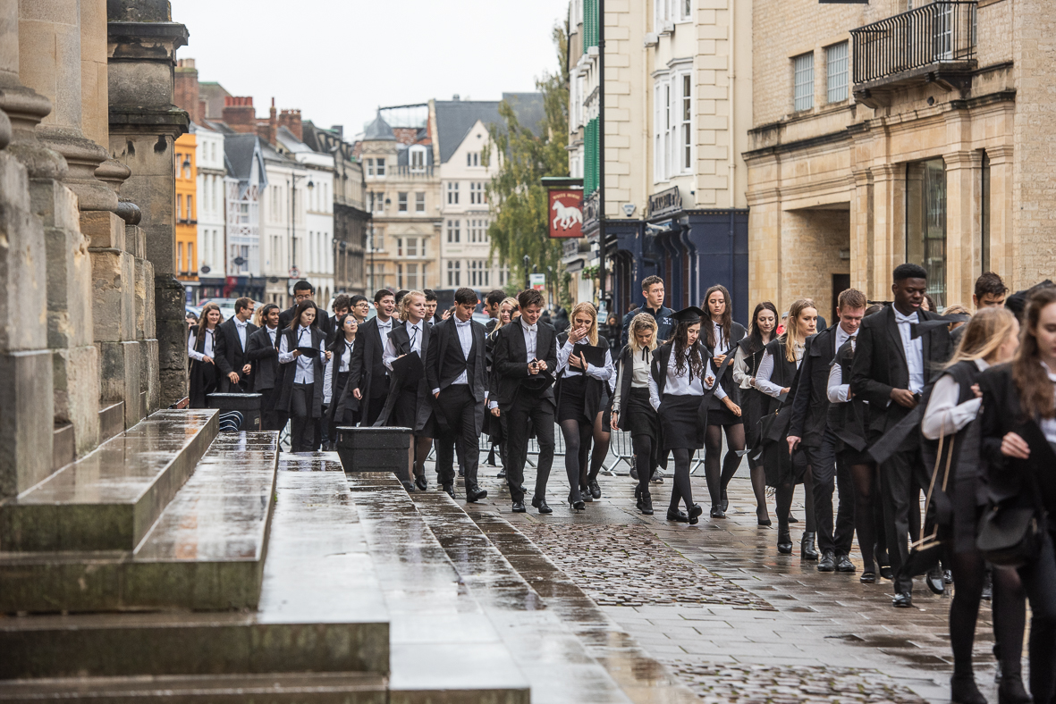 The new students endured a soggy thirty-second walk from college to Sir Christopher Wren’s architectural masterpiece for the ancient Latin induction ceremony in which, among other things, students agree not to kindle any flame in the libraries.