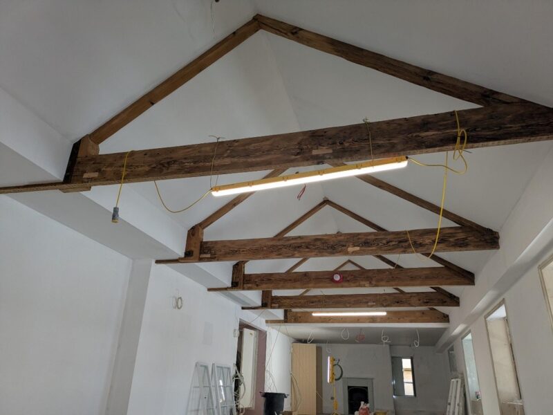 In the West Range, additional fireproofing required for the second floor has been completed and the timber floors will be refixed shortly. The second fix joinery including skirting, door linings and ironmongery is being installed on all floors. Making good of existing walls is progressing well, and initial decorations have commenced. Existing windows are being removed, prepped, and decorated. Following the fire curtain support steelwork installation last week, sub-contractors have re-surveyed these openings and are preparing final construction drawings before going into manufacture, and likewise for the glass partitions.